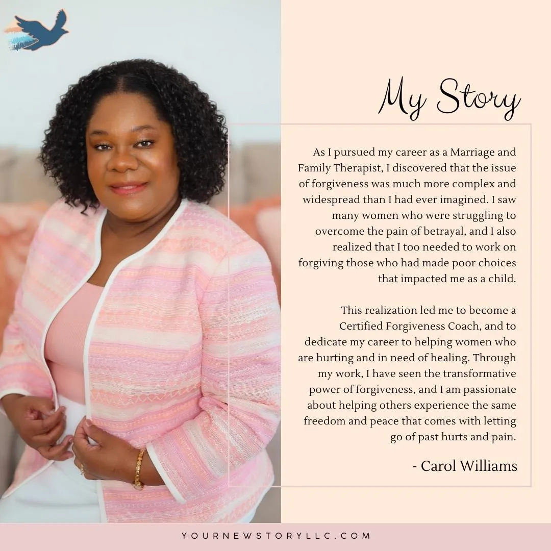 Carol Williams is a highly sought-after public speaker known for her ability to inspire audiences to embrace forgiveness as a pathway to inner peace and personal transformation. With engaging presentations, practical strategies, and real-life stories, Carol equips her audiences with essential tools to navigate life's challenges and cultivate emotional resilience.